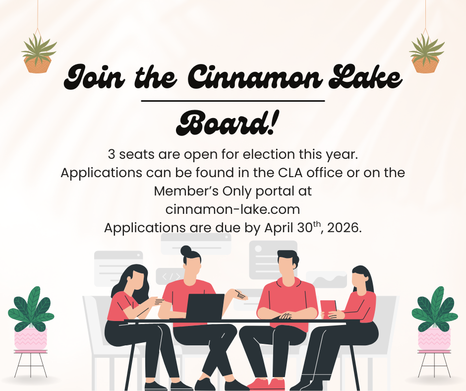 2026 Elections for new Board Members will be held later this year. 3 seats are open this year. Applications can be found in the office or on the Member's Only portal on the Cinnamon Lake website. Applications are due by April 30th, 2026.